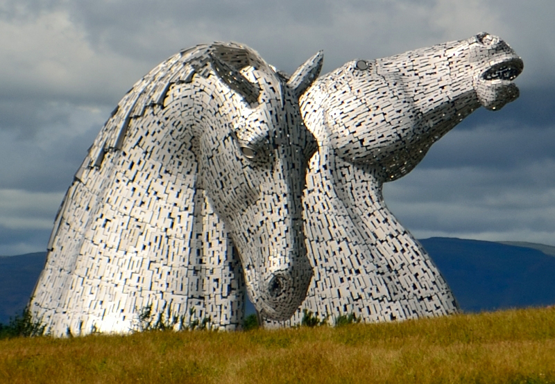 The Kelpies are 30-metre high horse-head sculptures, standing next to a new extension to the Forth and Clyde Canal in The Helix, a new parkland project built to connect 16 communities in the Falkirk Council Area, Scotland