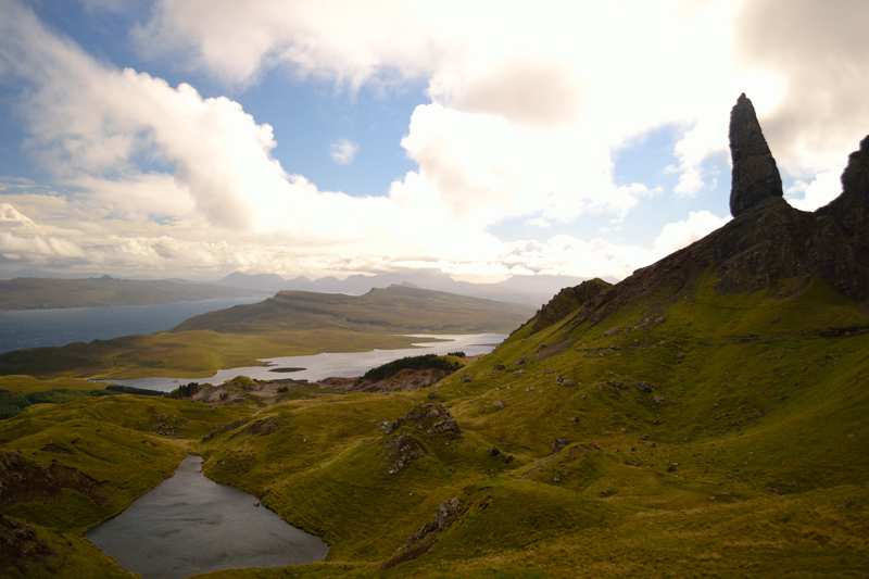 The view from The Storr over the sound of Rassay with Loch Leathan in the foreground and the Cuillins in the distance.